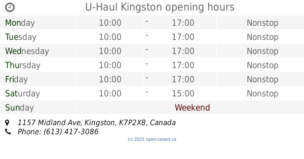 Add it to your website, your phone or even your desktop - opening times, phone numbers and the road to Office of the U-Haul In Kingston, 1157 Midland Ave.